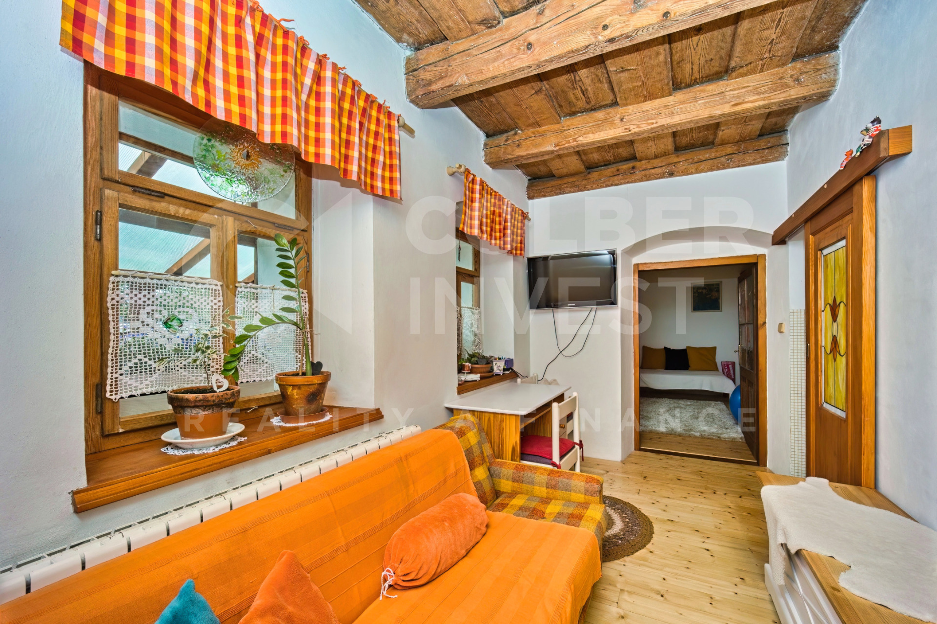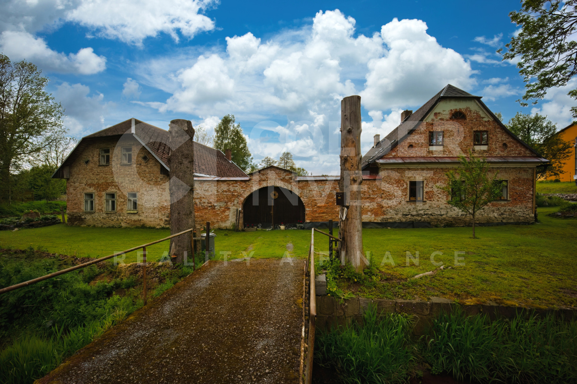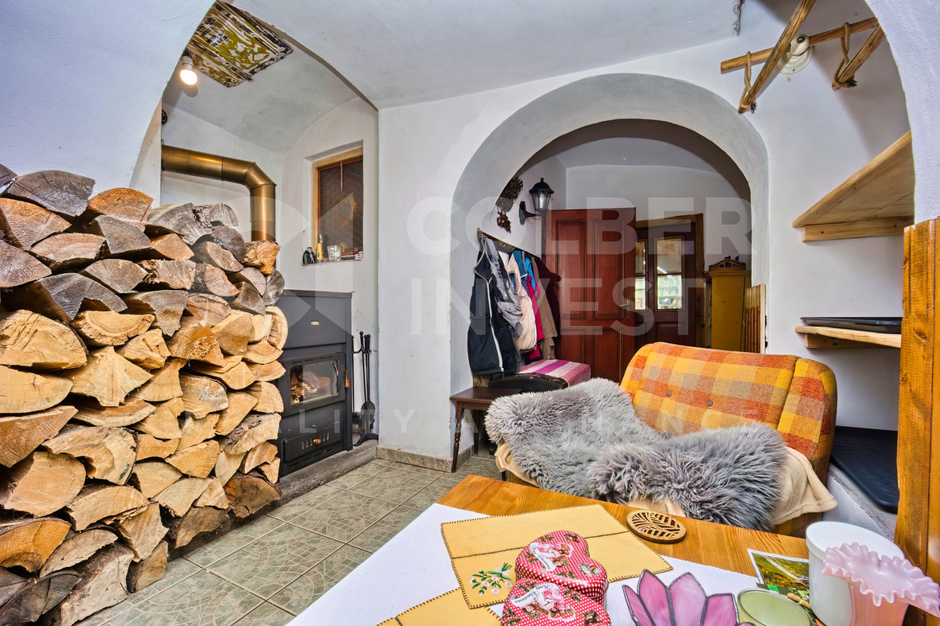 K dispozici je v 1.NP zádveří s průchozí chodbou vedenou napříč budovou, umožňující vstup do bytu 1+1 a bytu 1+kk s koupelnou a WC, dále do samostatné koupelny s WC a prostorného (hlavního) obývacího pokoje (společenské místnosti o pl. 56 m2). Na konci chodby je další zádveří s přístupem do klenbového sklepa s nevyužitou studnou a výstupem do uzavřené, zatravněné dvorní části s posezením.
