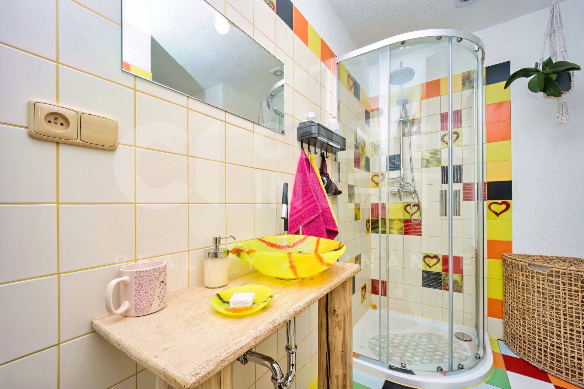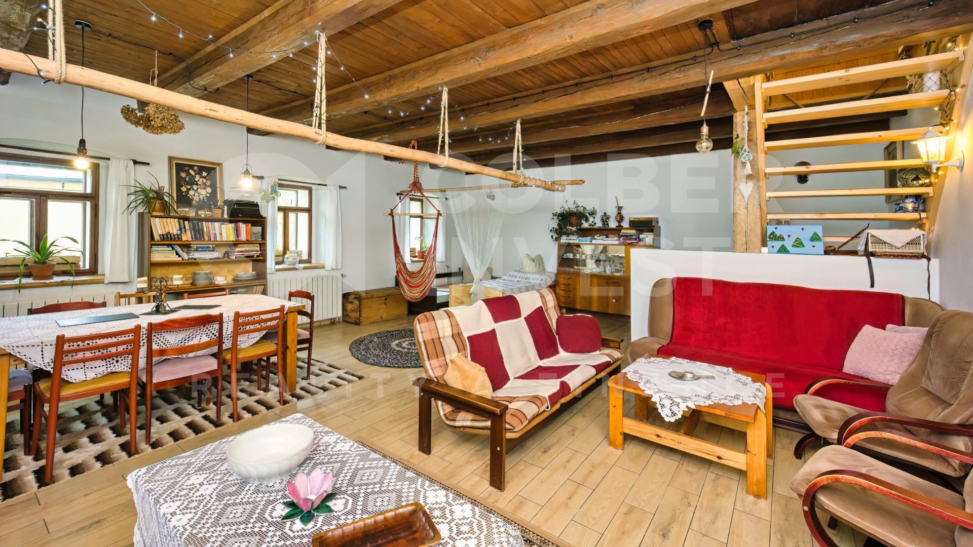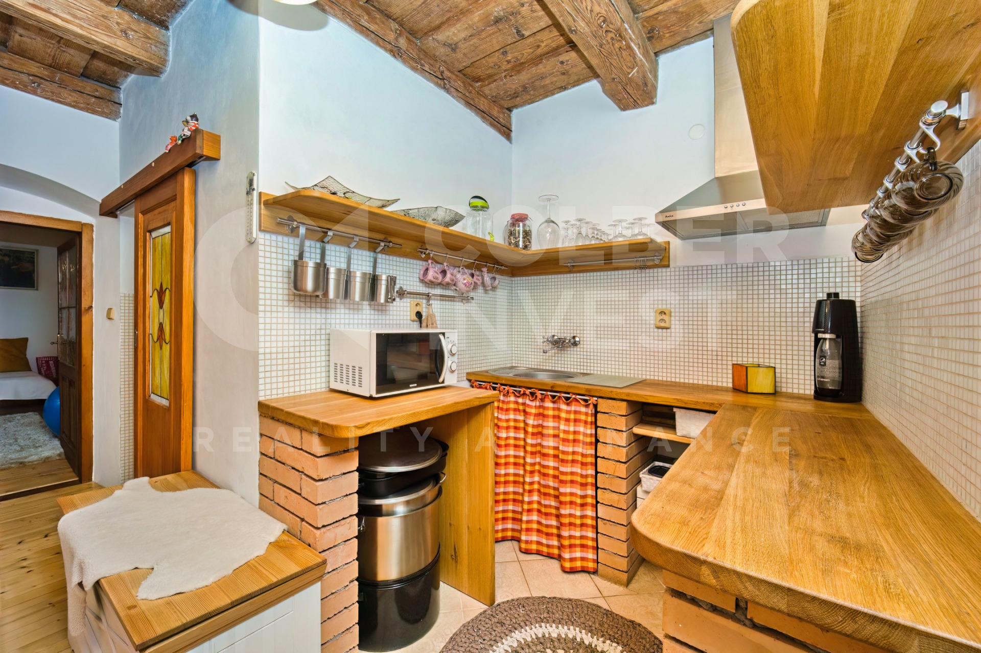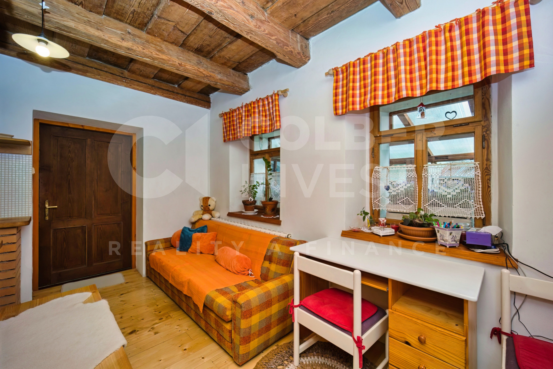 K dispozici je v 1.NP zádveří s průchozí chodbou vedenou napříč budovou, umožňující vstup do bytu 1+1 a bytu 1+kk s koupelnou a WC, dále do samostatné koupelny s WC a prostorného (hlavního) obývacího pokoje (společenské místnosti o pl. 56 m2). Na konci chodby je další zádveří s přístupem do klenbového sklepa s nevyužitou studnou a výstupem do uzavřené, zatravněné dvorní části s posezením.