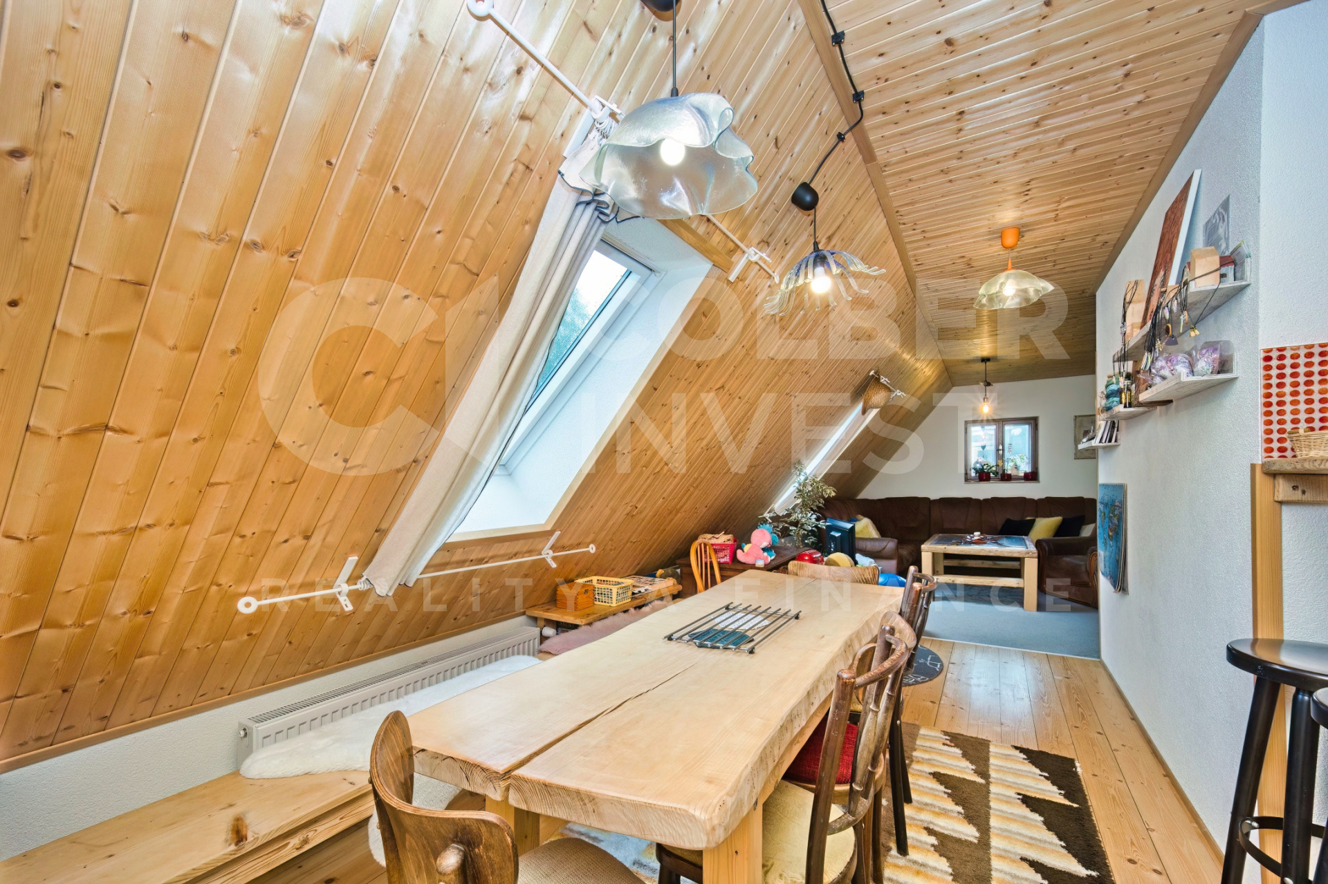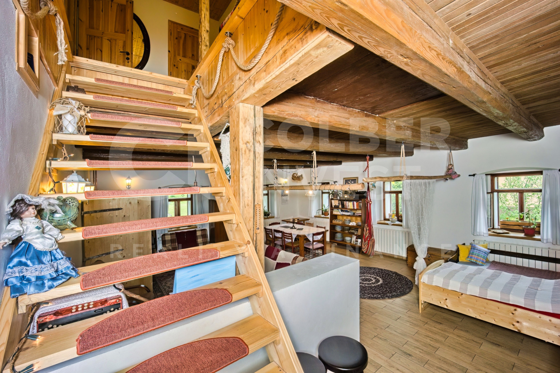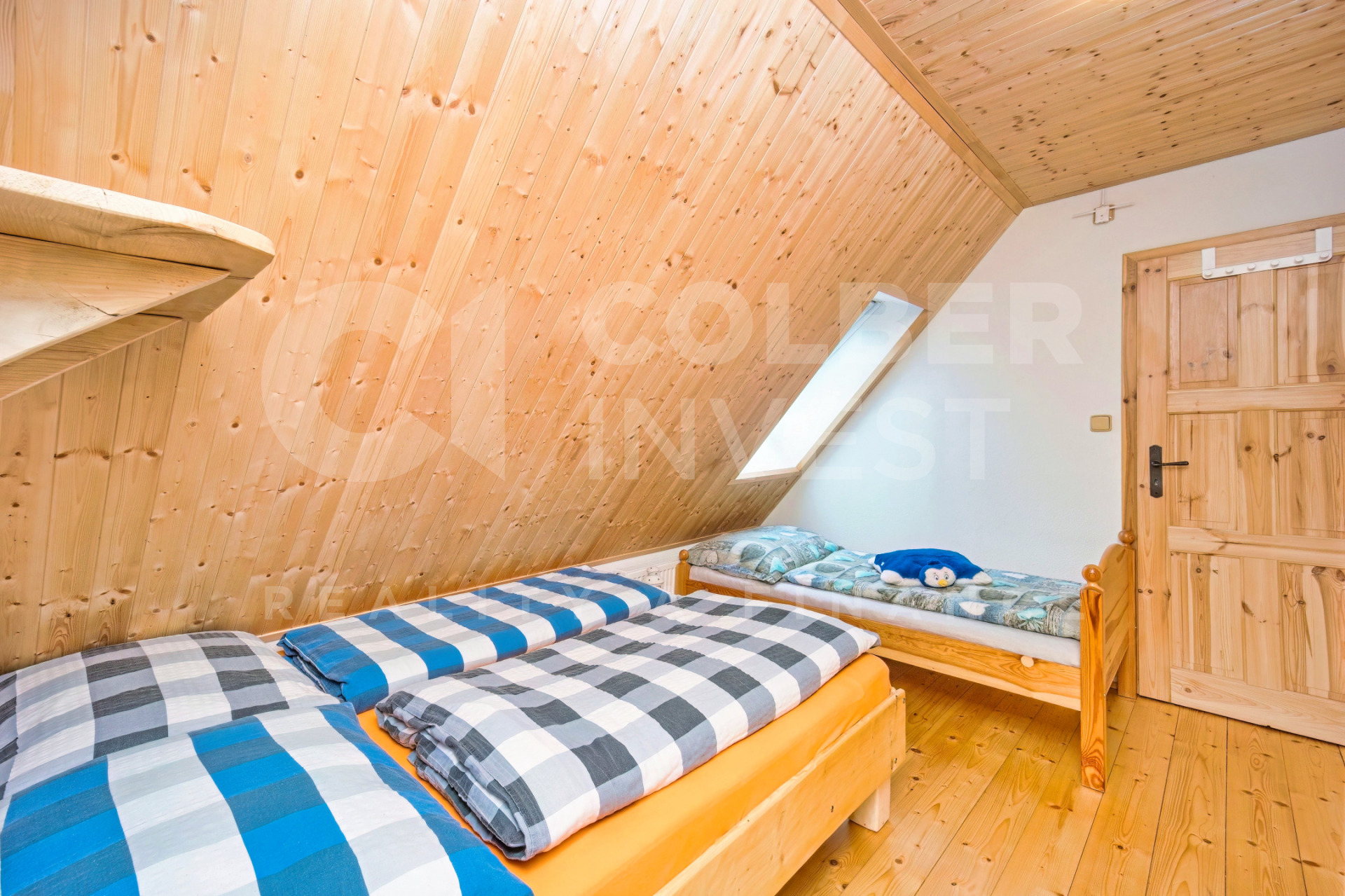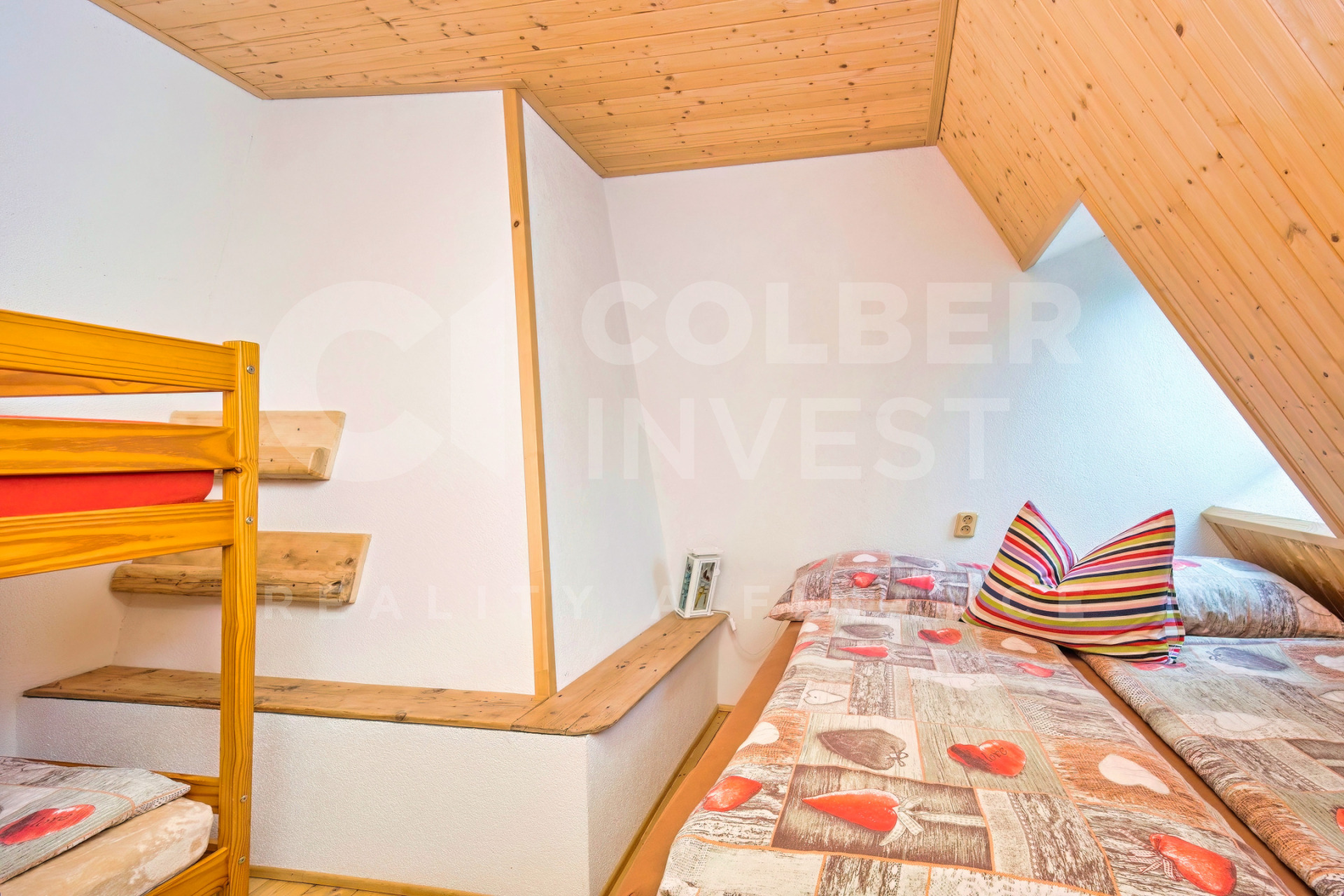 Podkroví, nyní využívané pouze pro rodinnou rekreaci, přístupné jak z hlavního obývacího pokoje dřevěným, uzavíratelným schodištěm tak i přímo samostatným, venkovním schodištěm umístěným ve štítové části budovy, nabízí 4 pokoje s kapacitou 15 lůžek, obývací - společenskou místnost s jídelní částí a prostorným kuchyňským koutem, 2 koupelny s WC (jedna i s bidetem), samostatné WC a technickou místnost.