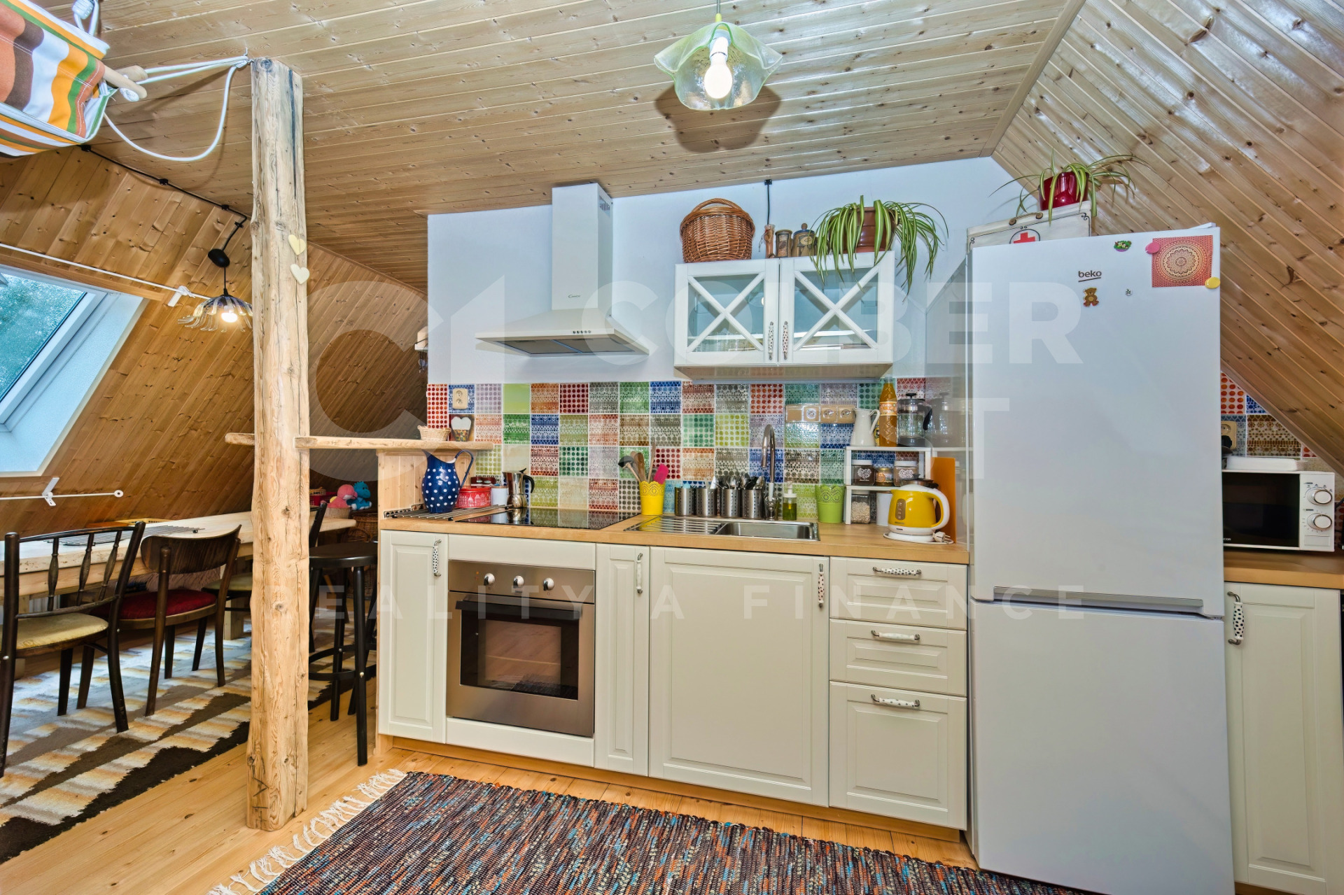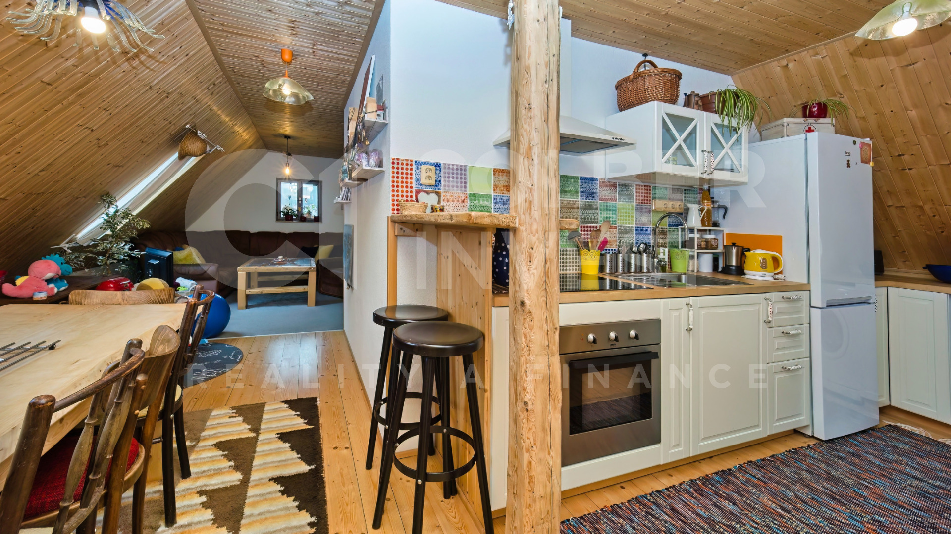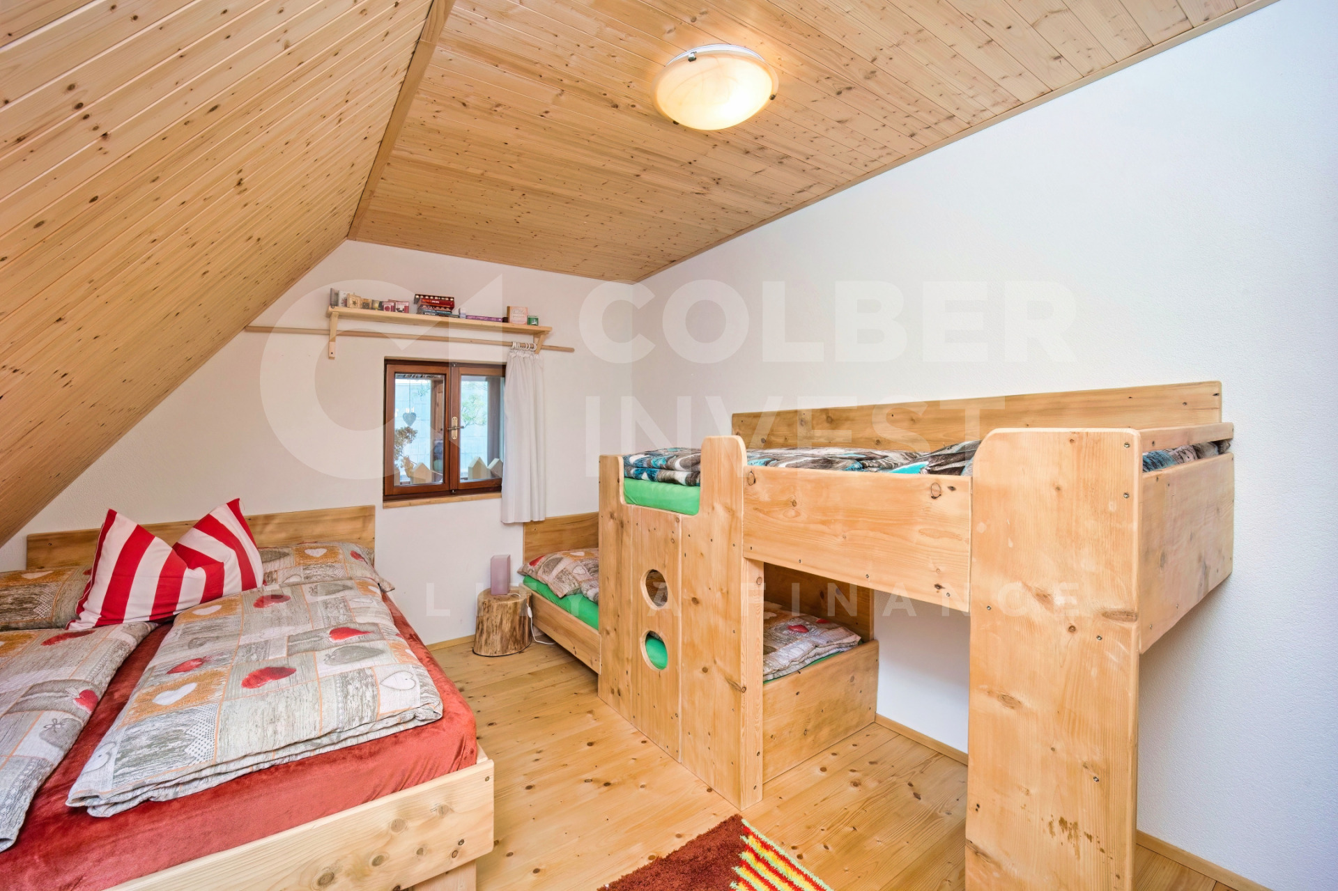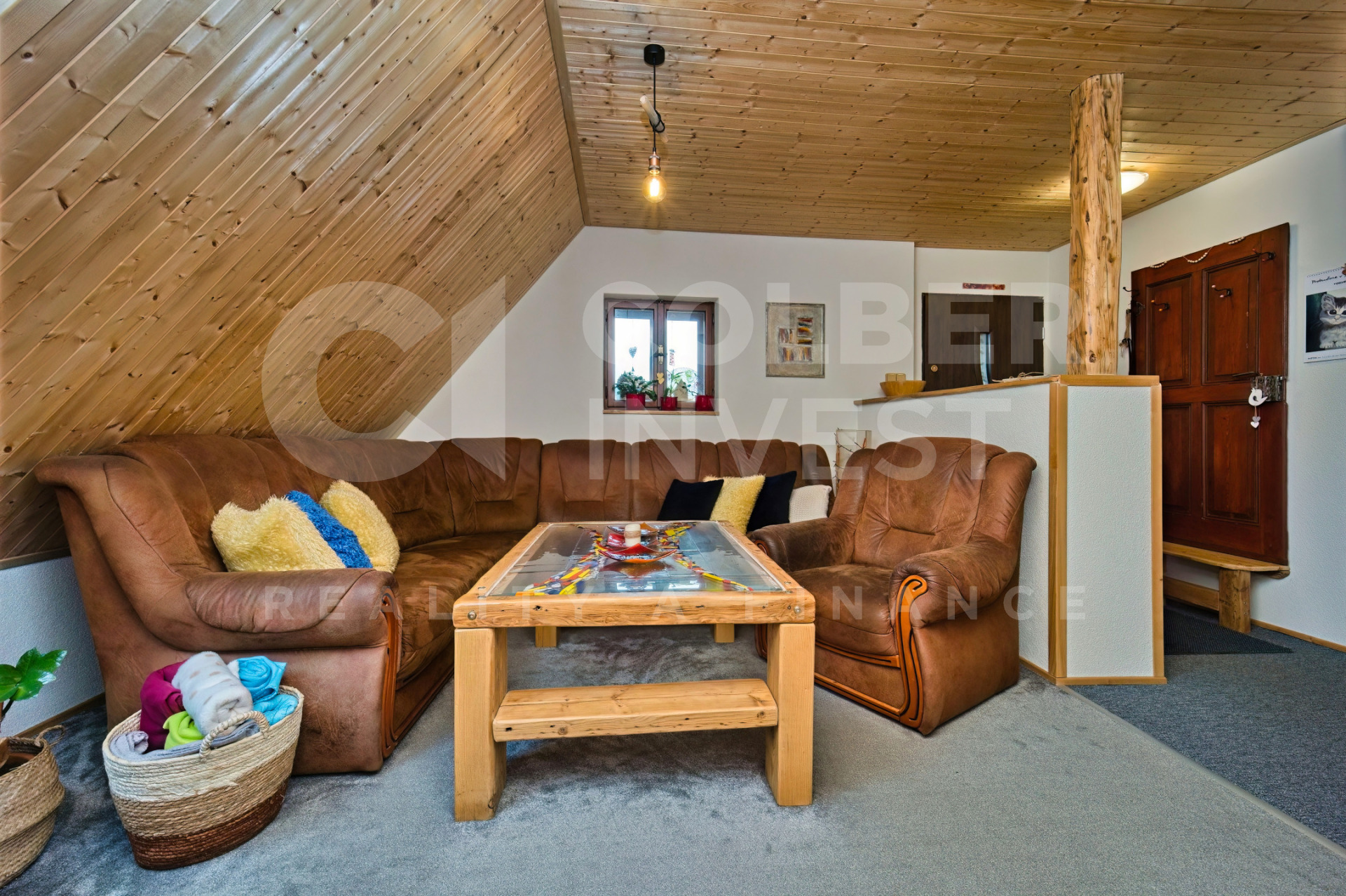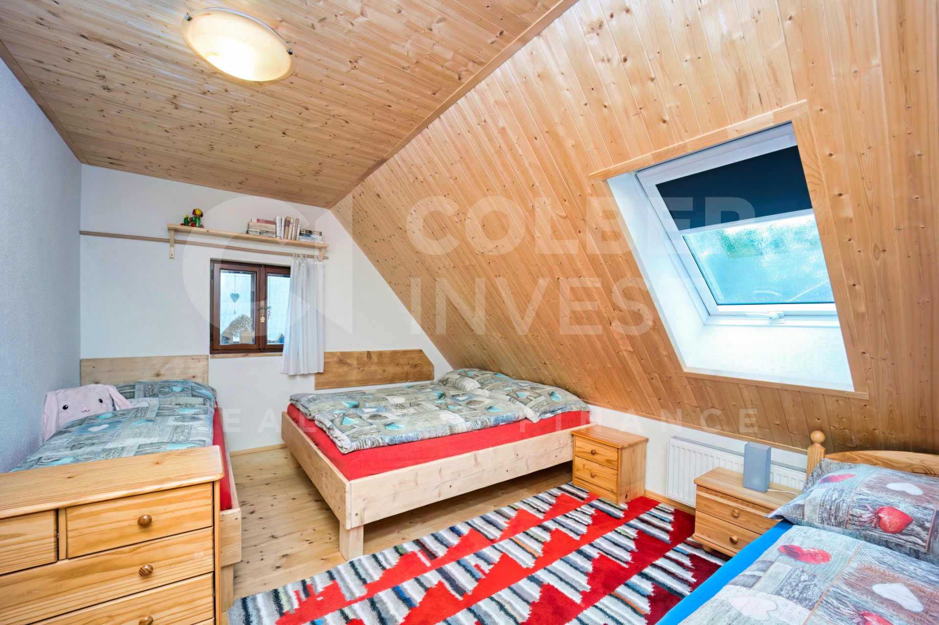 Podkroví, nyní využívané pouze pro rodinnou rekreaci, přístupné jak z hlavního obývacího pokoje dřevěným, uzavíratelným schodištěm tak i přímo samostatným, venkovním schodištěm umístěným ve štítové části budovy, nabízí 4 pokoje s kapacitou 15 lůžek, obývací - společenskou místnost s jídelní částí a prostorným kuchyňským koutem, 2 koupelny s WC (jedna i s bidetem), samostatné WC a technickou místnost.